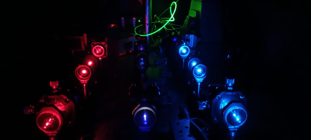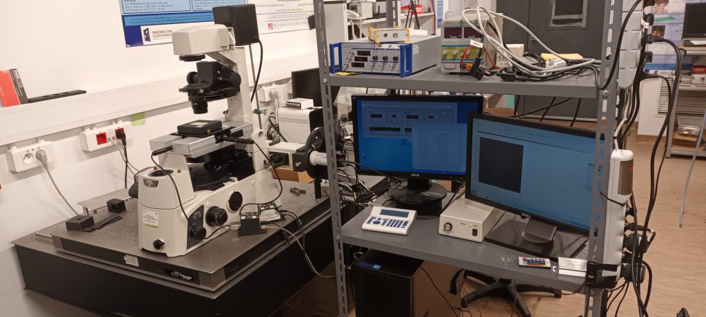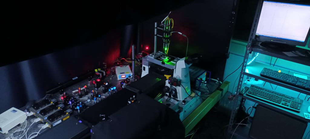 Nasze laboratoria wyposażone są w kilka autorskich układów mikroskopowych (konfokalnych i szerokiego pola) optymalizowanych pod kątem różnych możliwości pomiarowych. Mikroskopy te pozwalają na pracę w szerokiem zakresie spektralnym (UV-Vis-NIR), pozwalają na obrazowanie natężenia luminescencji próbek, pomiar widm emisji, jak również na pomiary czasowo-rozdzielcze w szerokim zakresie dynamicznym (od milisekund po nanosekundy). Pozwalają one na prowadzenie badań na poziomie pojedynczych emiterów, co obejmuje również wybrane aspekty obrazowania super-rozdzielczego. Układy posiadają także możliwości mikromanipulacji oraz organizacji nanostruktur. Prowadzone eksperymenty dotyczą takich dziedzin jak plazmonika, przekazy energii, sensoryka, termometria oraz fotonika.